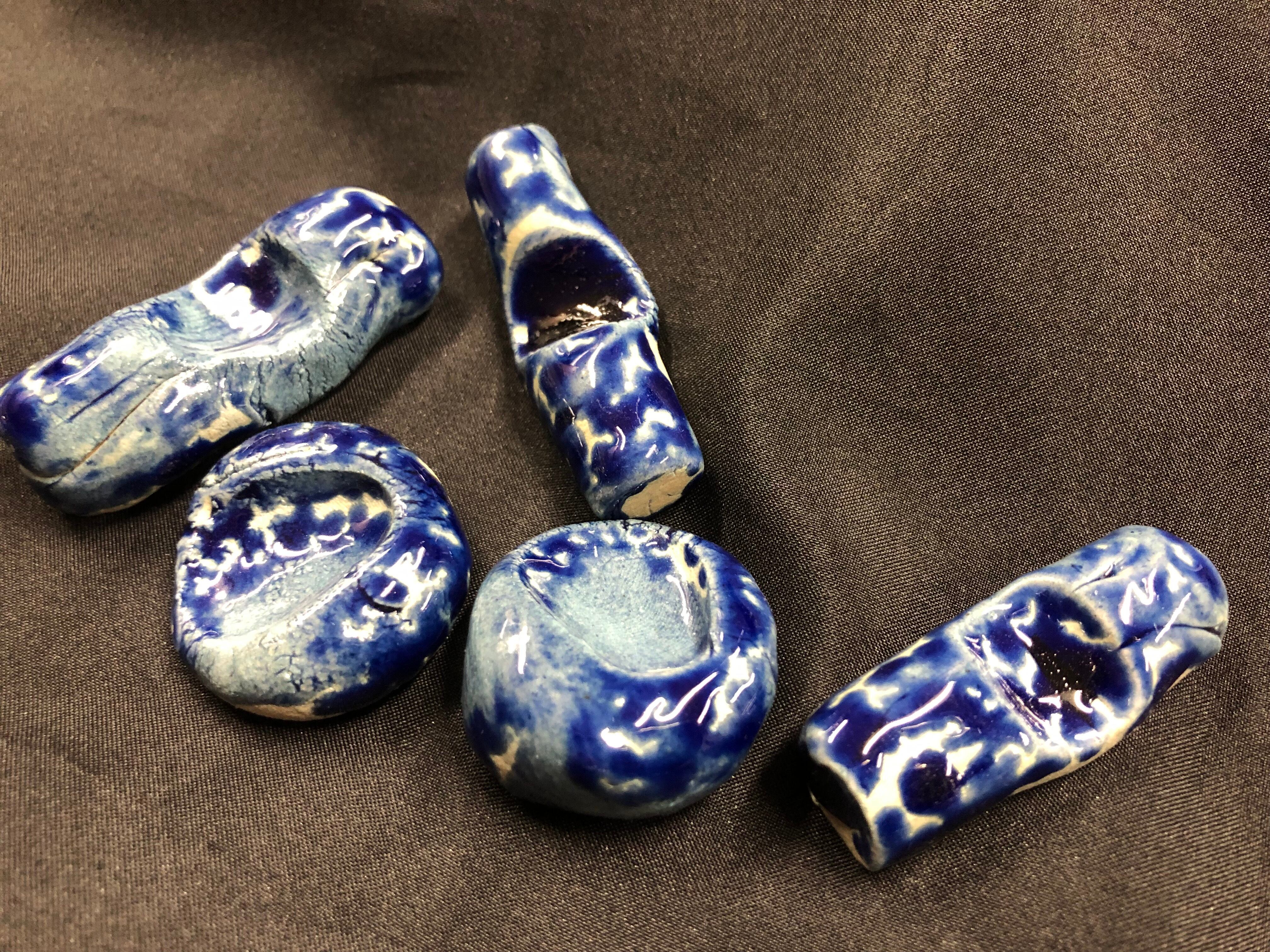 丸形幅3.5cm×高さ1.5cm 四角長さ4.5~5.5cm×高さ1.5cm 青色が鮮やかな箸置きセットです。 全て一点物ですので、サイズは上記のようにバラバラとなります。 丸形2点、四角3点の計5点セットです。 こちらの商品はセット販売となります。